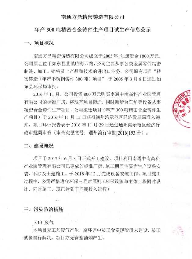 年產(chǎn)300噸精密合金鑄件生產(chǎn)項(xiàng)目試生產(chǎn)信息公示